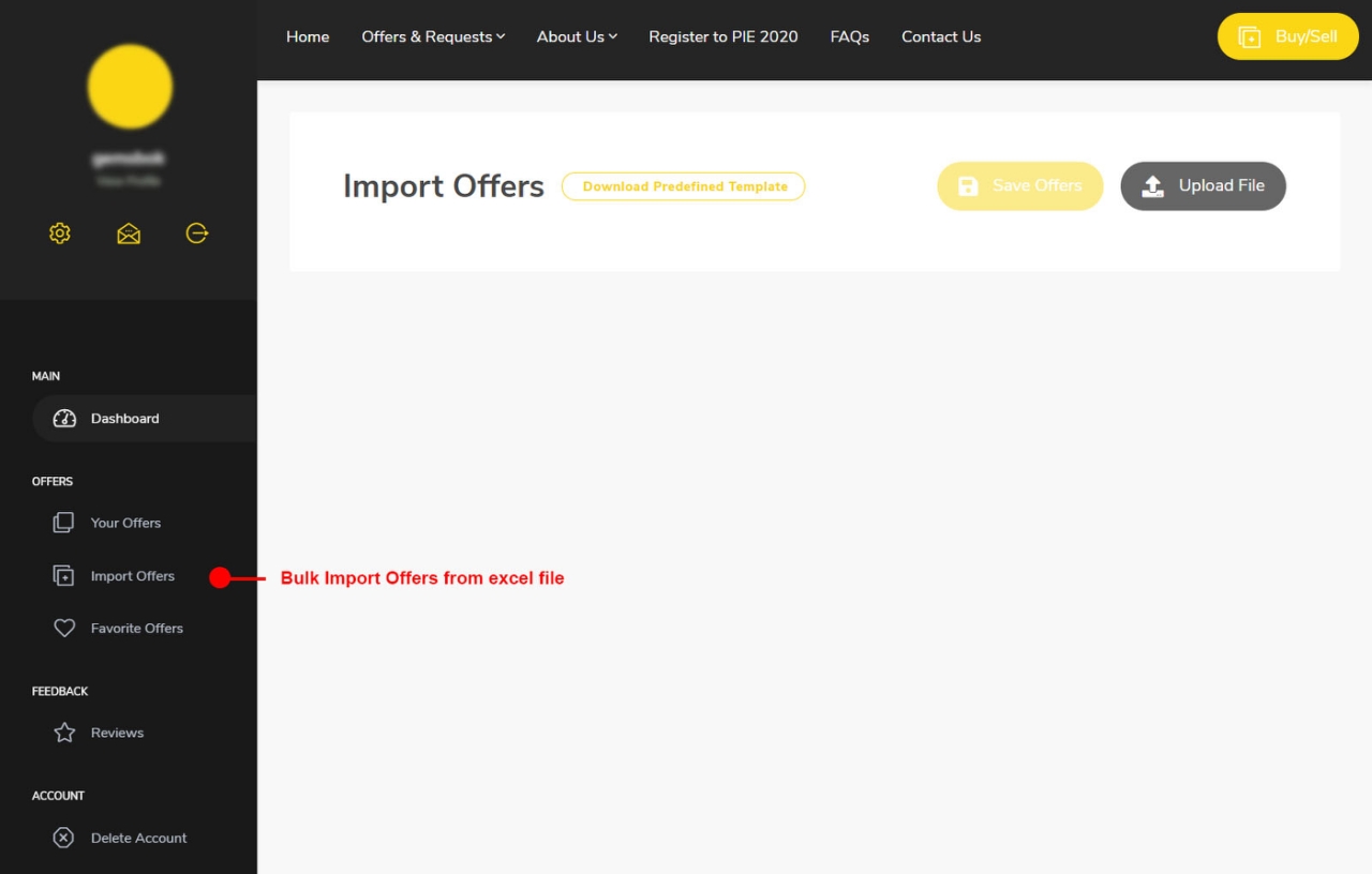Navigate to the Account Dashboard page by clicking ‘Your account’ icon once logged in. In the left sidebar menu select “Import Offers”.